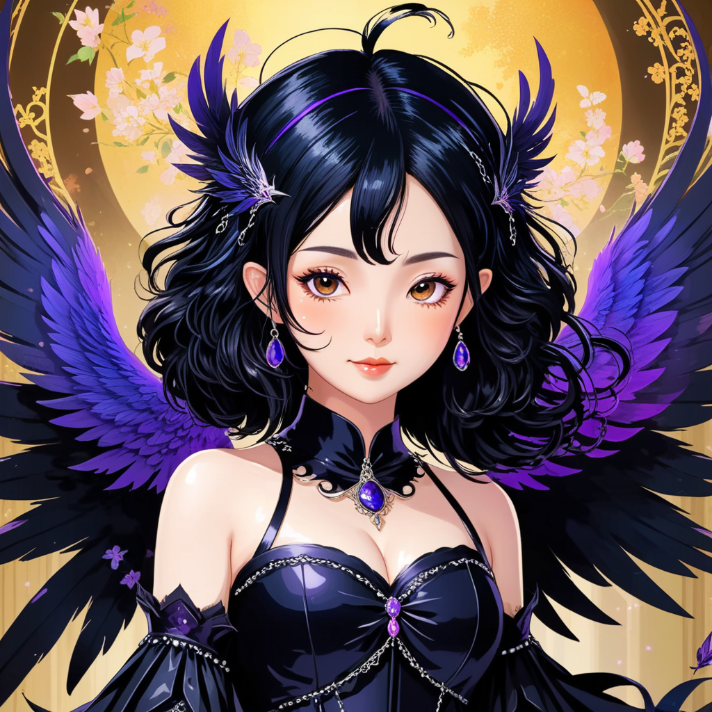 a woman in a black dress with purple wings