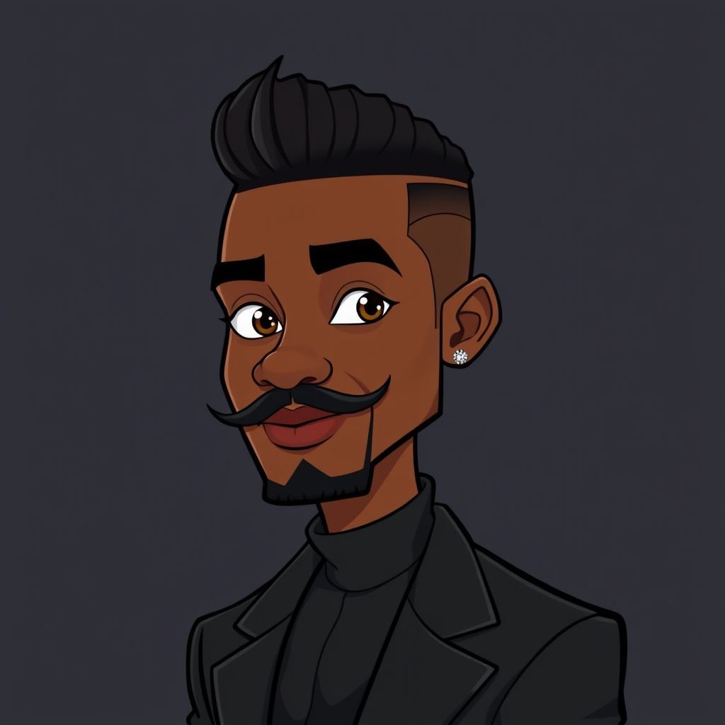 My avatar must be African with a taper haircut and a moustache , he must wear an all black outfit with small diamond ear...
