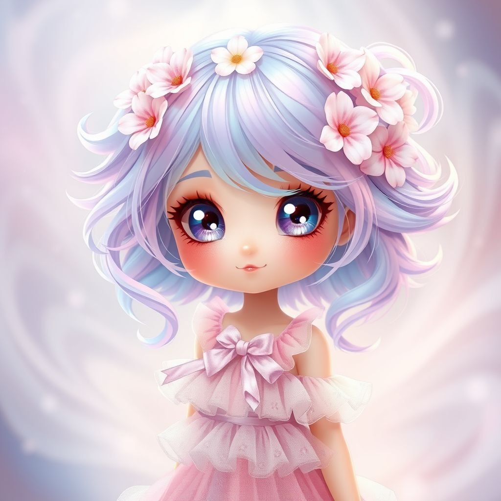 Kawaii chibi style of a girl with brown hair and brown eyes with a chocolate lab that is a service dog