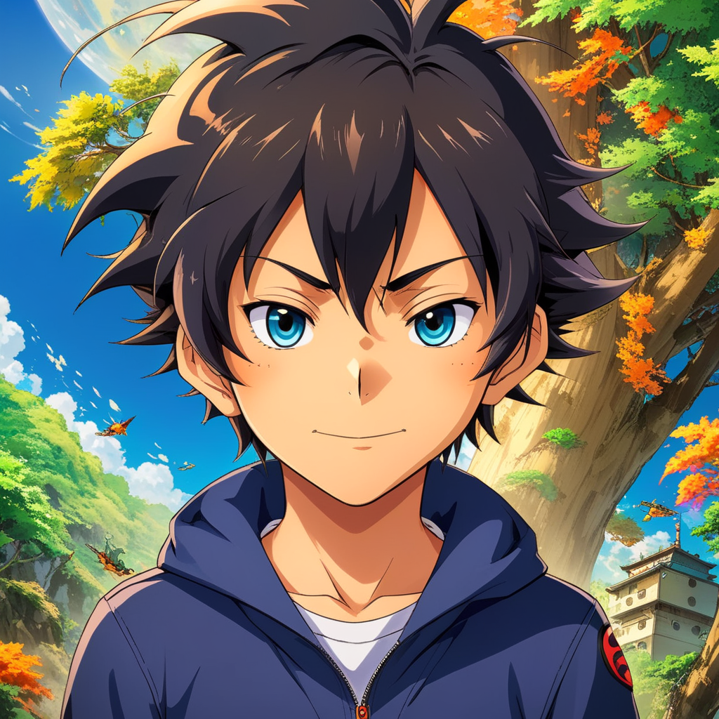 an anime character with blue eyes standing in front of a tree