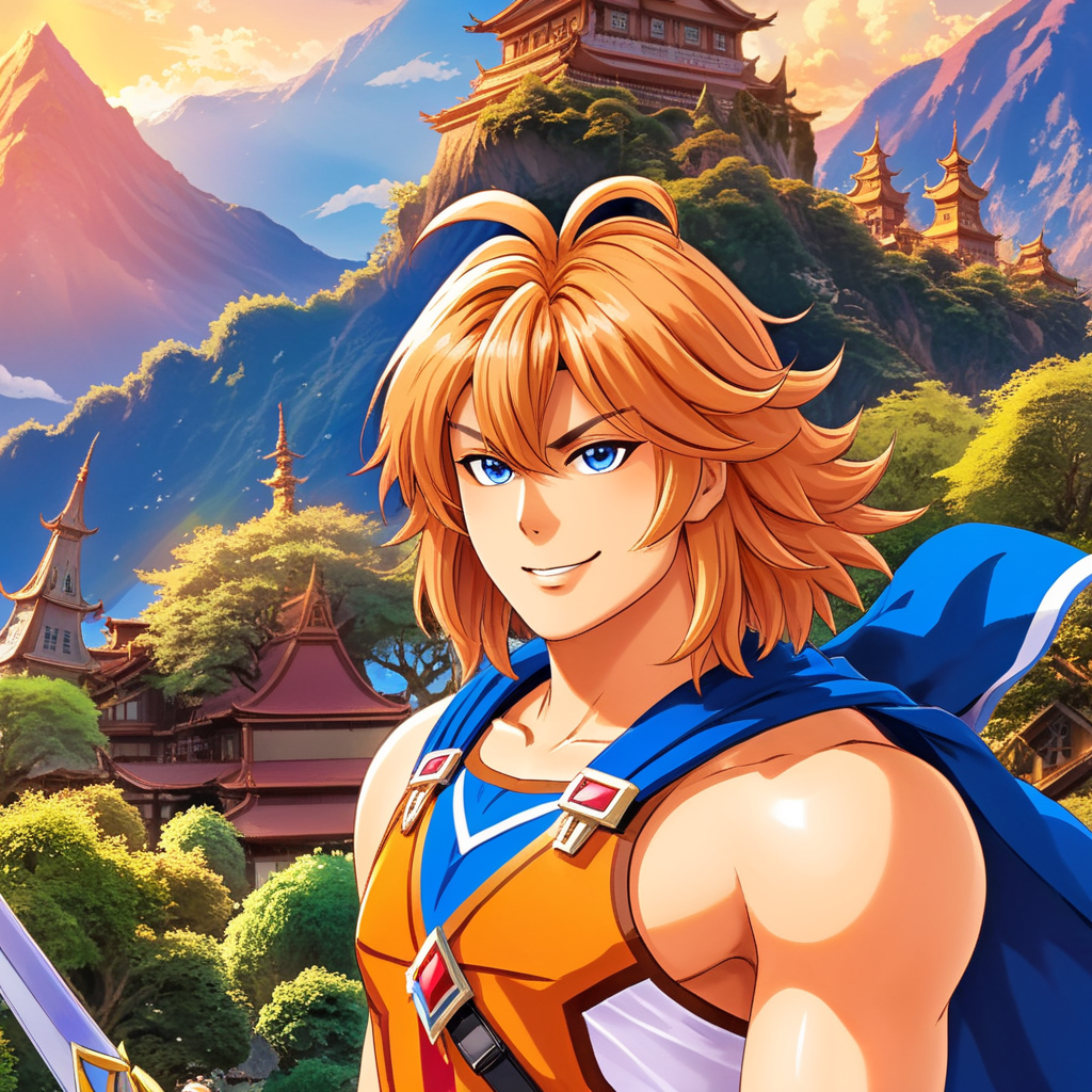 a young man in a yellow shirt holding a sword
