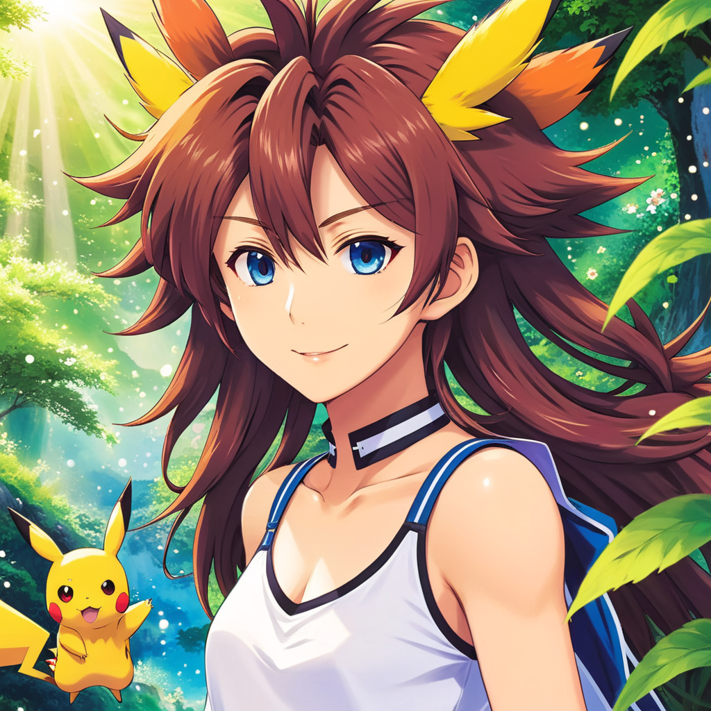 a girl with long hair and blue eyes holding a pikachu