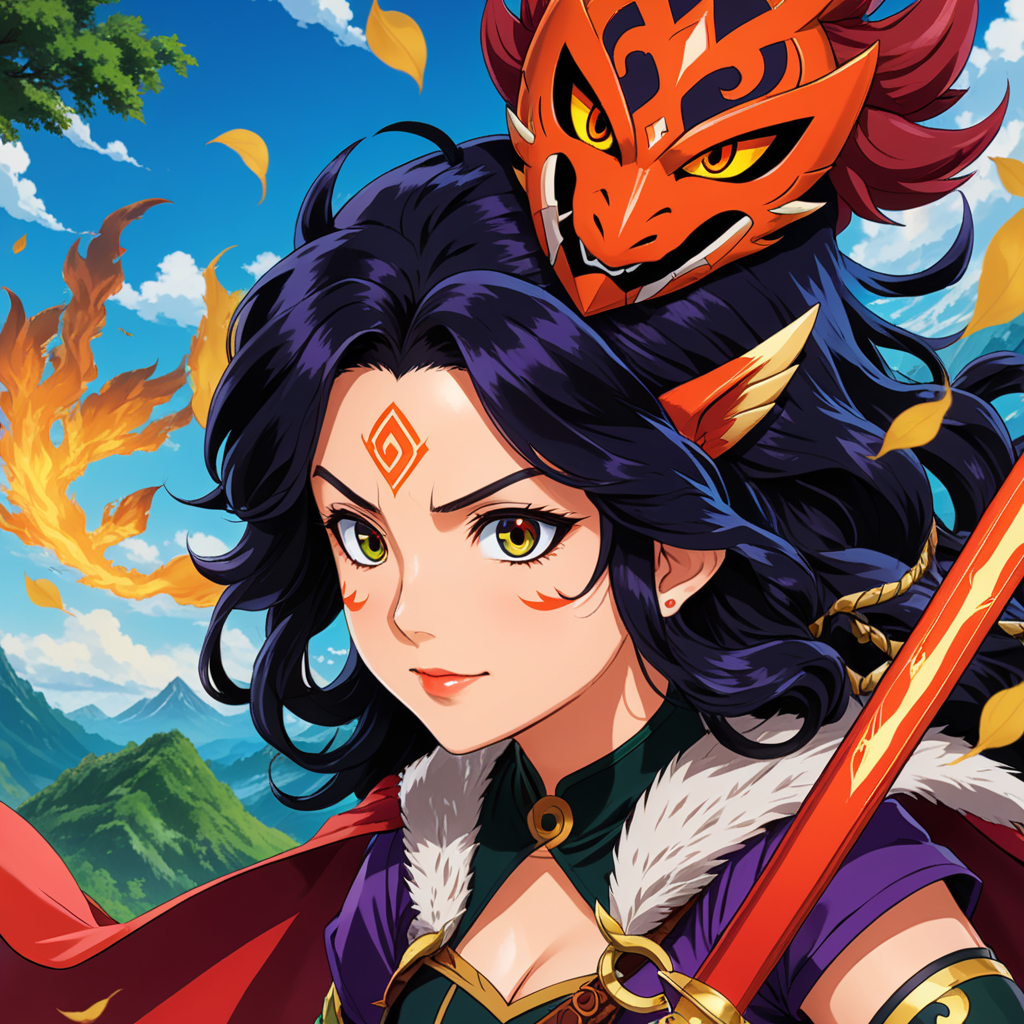 a girl in a blue shirt and red bow tie standing in front of a forest