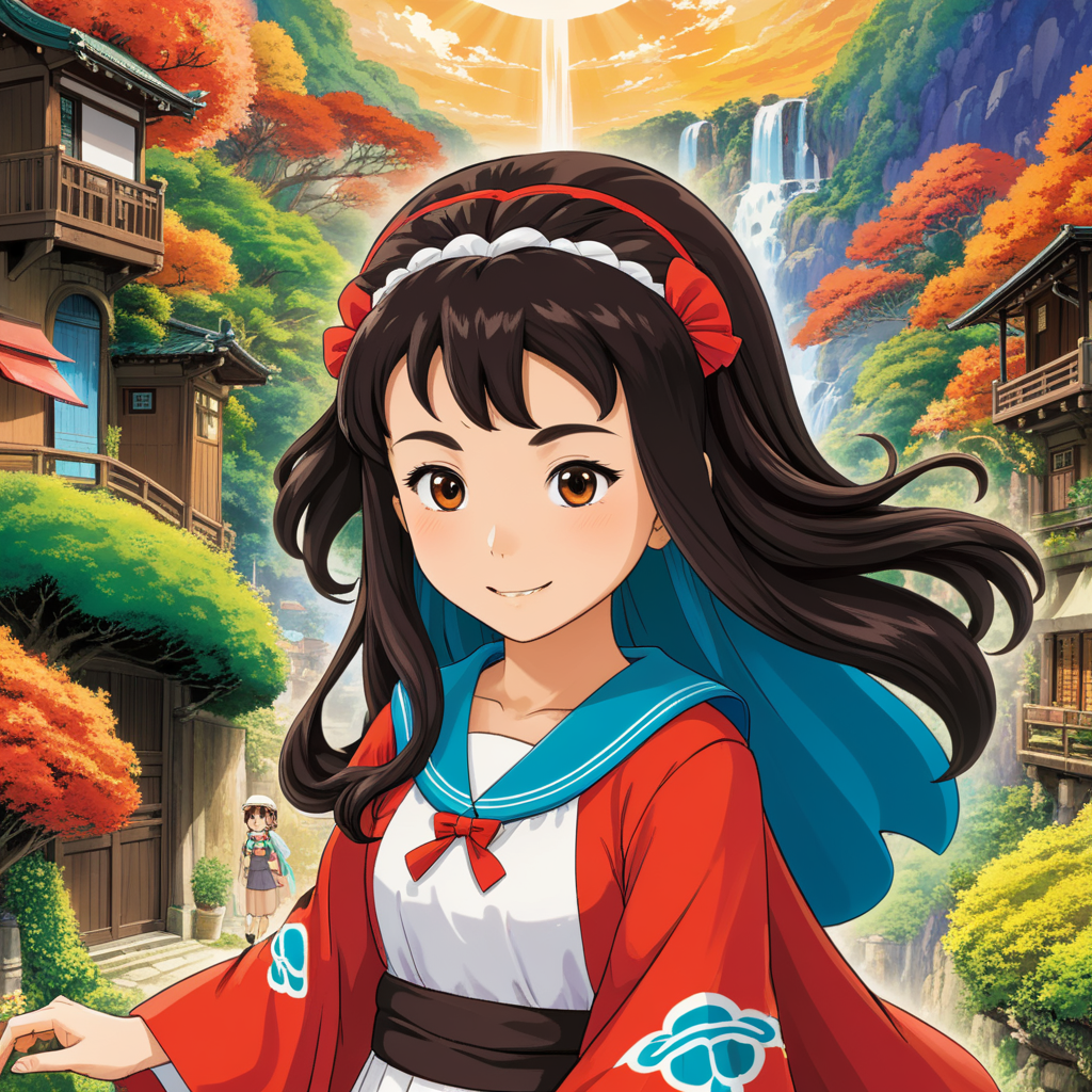 a young girl in a red shirt is flying over a mountain