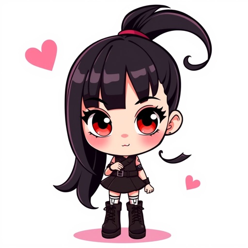Black hair emo pony tail black boots black skirt black red eyes soft lips