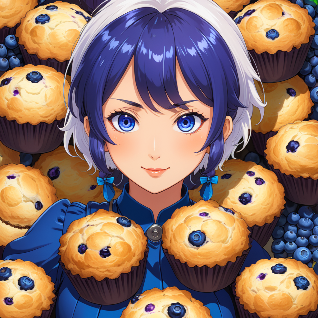 a girl surrounded by muffins and blueberries