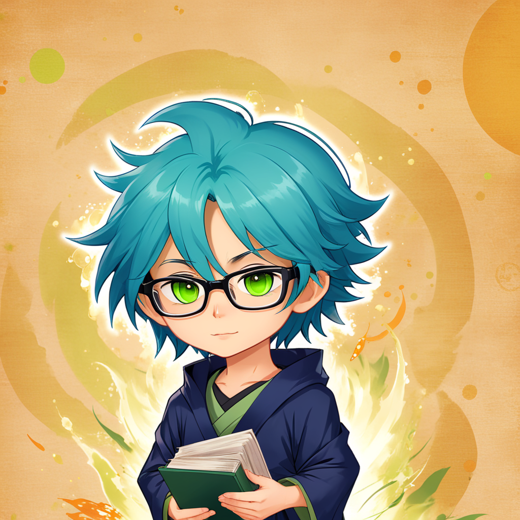 a boy with blue hair and glasses holding a book