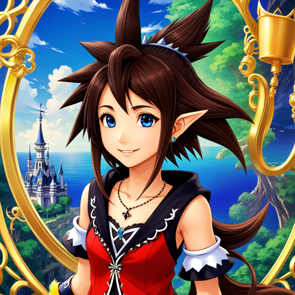 a girl with red hair and blue eyes standing in front of a castle