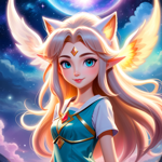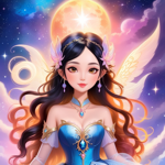 a girl with blonde hair and blue eyes standing in front of a moon