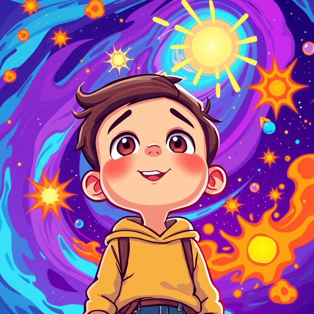 Make a very cool galaxy thing with some fire looking very cool and a boy looking at it like it’s an event