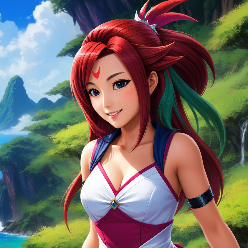 a woman with red hair standing in front of a waterfall