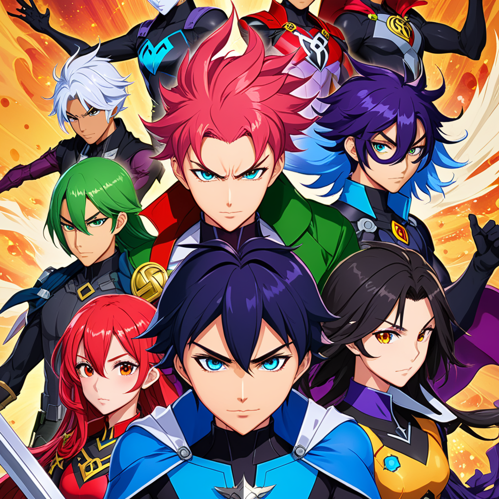 a group of anime characters standing in front of a forest