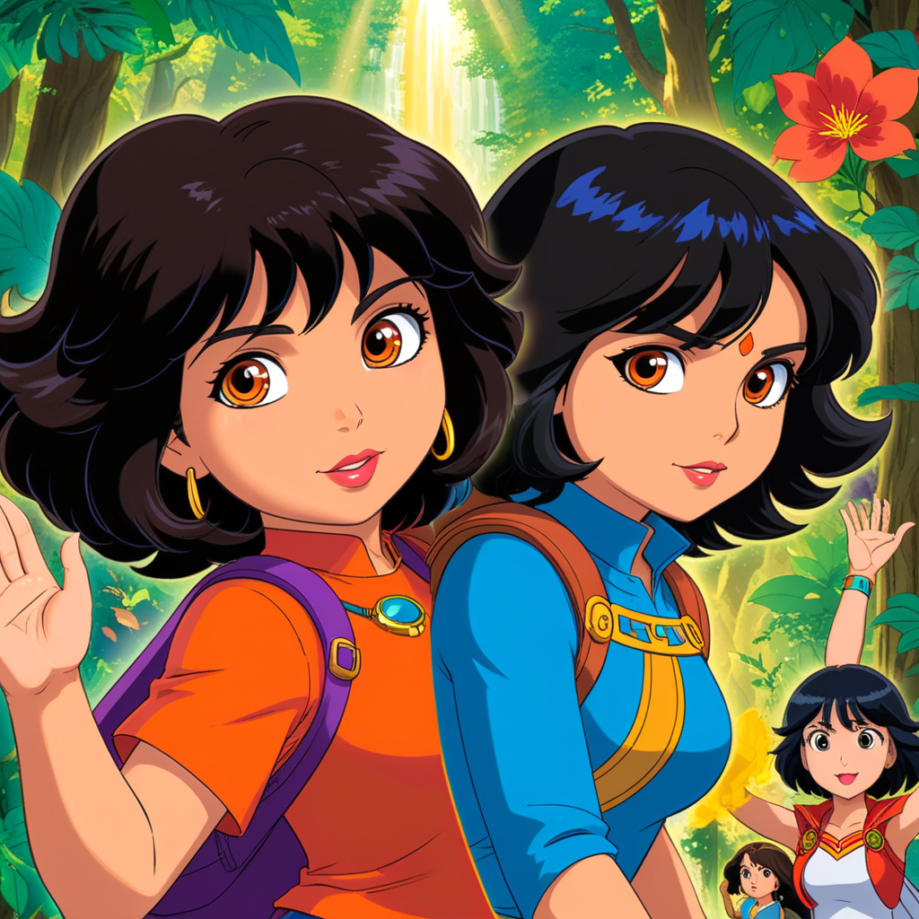a cartoon picture of two girls in the jungle