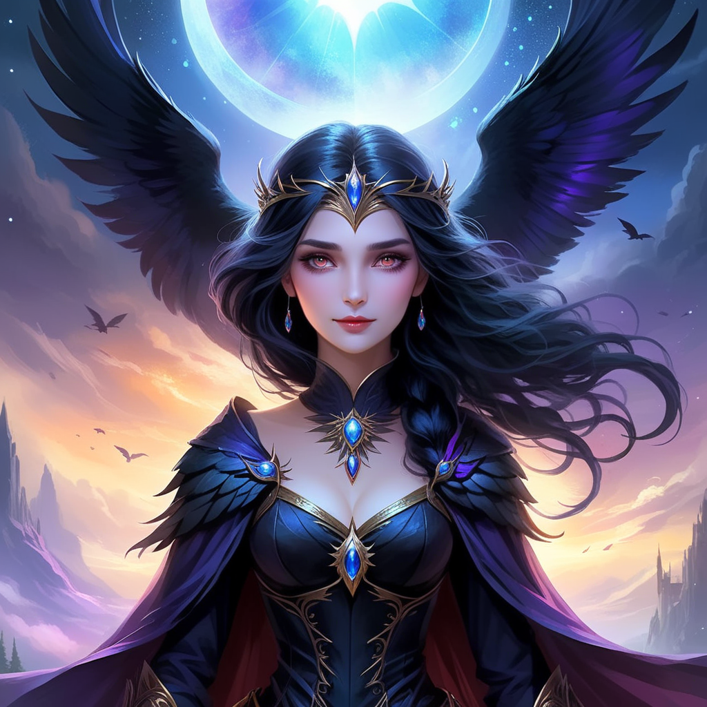a painting of a woman in a blue dress with angel wings