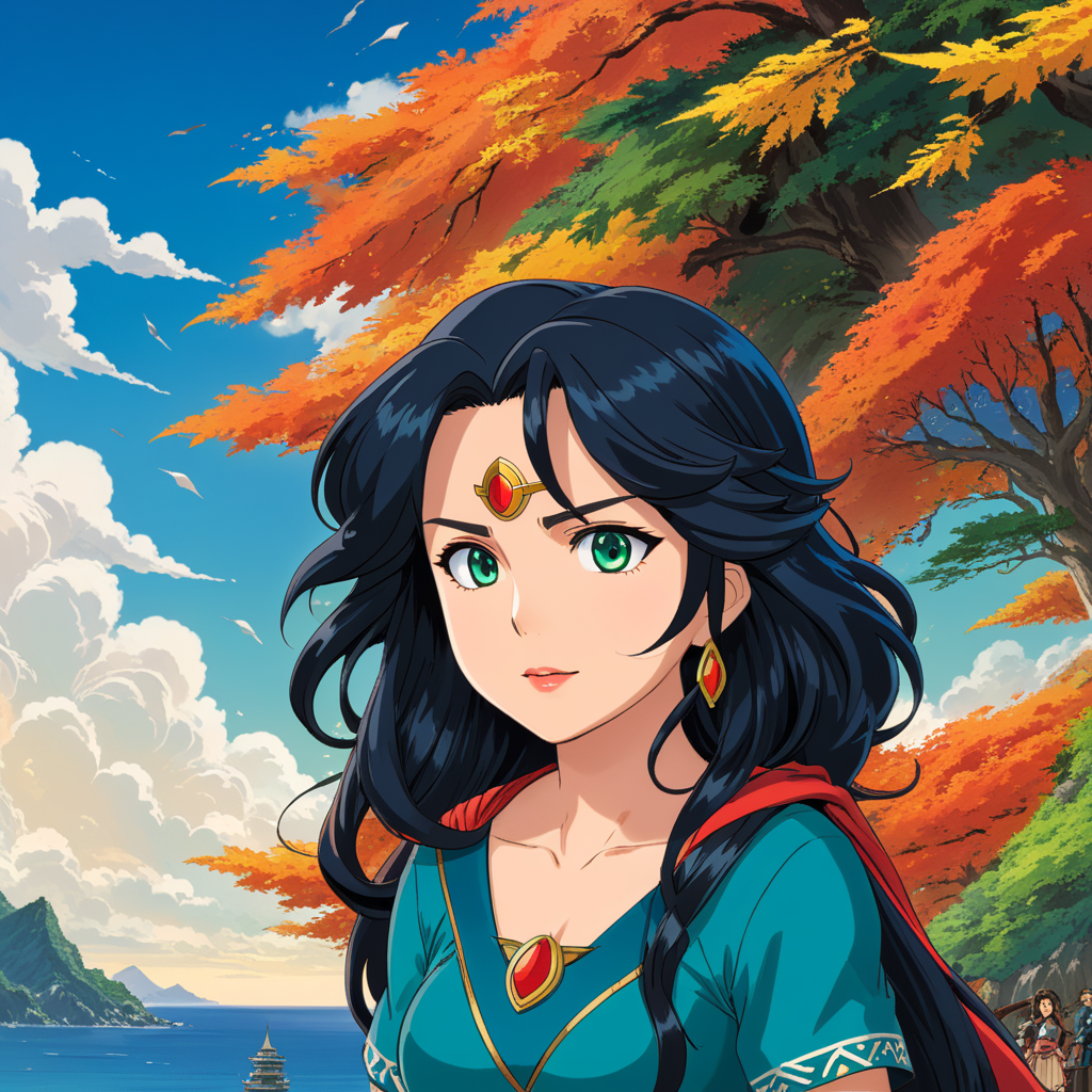 a young girl with long black hair and blue eyes wearing a blue dress