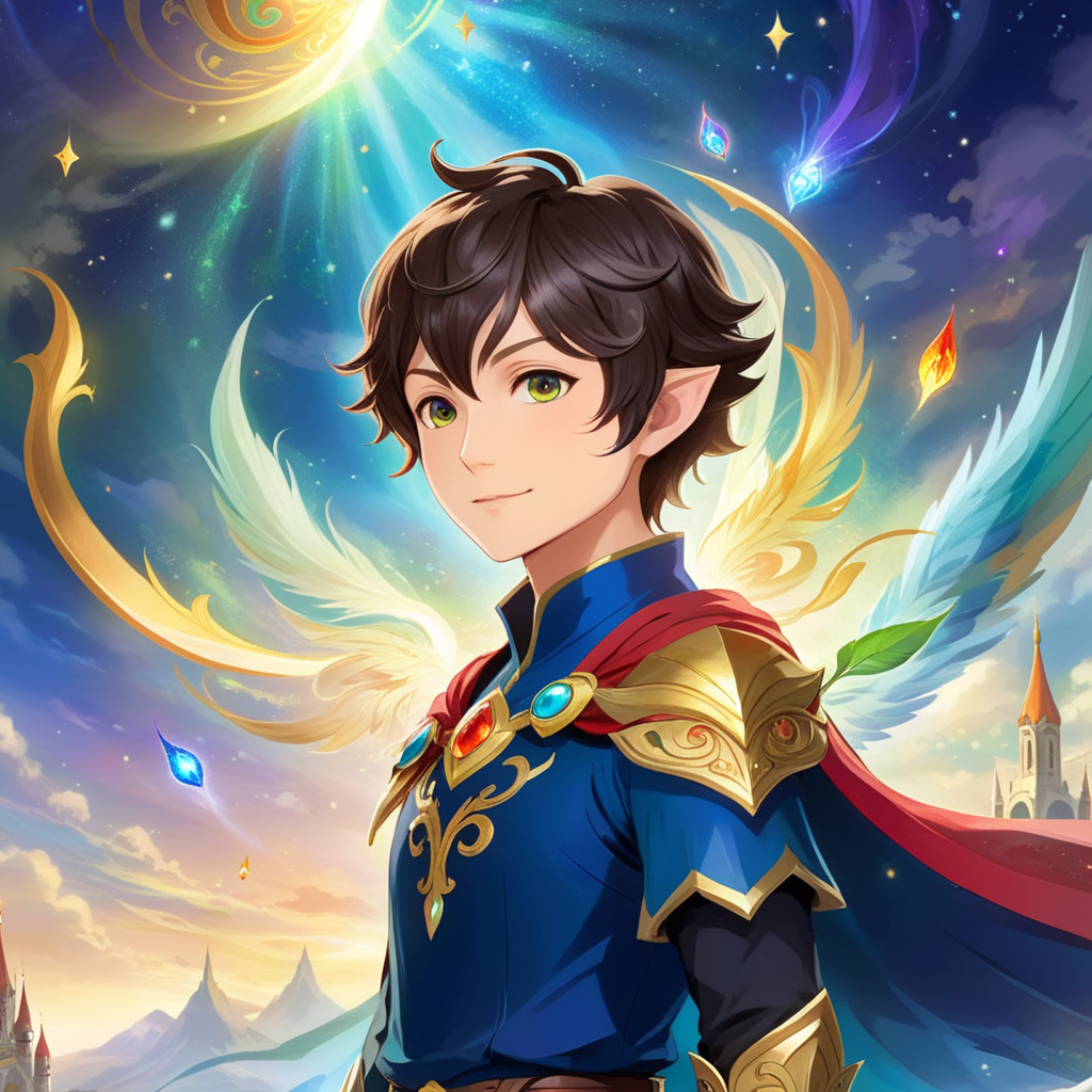 a boy standing in front of a waterfall with a castle in the background