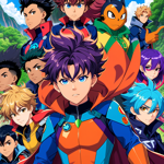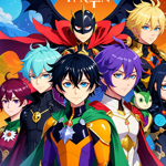 a group of anime characters standing in front of a colorful background