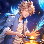 a man cooking on a skillet in front of a full moon