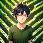 a young man standing in a green maze