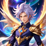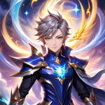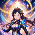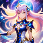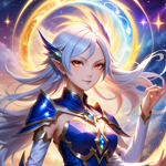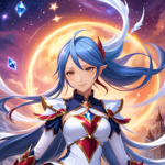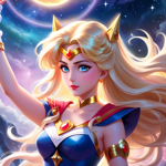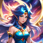 a woman in a blue and gold outfit holding a star
