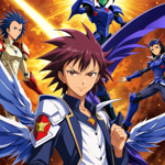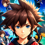 a group of anime characters standing in front of a blue sky