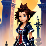 a woman in a blue outfit holding a sword
