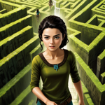 a woman with a ponytail standing in front of a maze