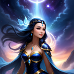 a woman in a blue cape holding a glowing ball