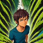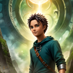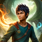 a young man standing in front of a lush green forest