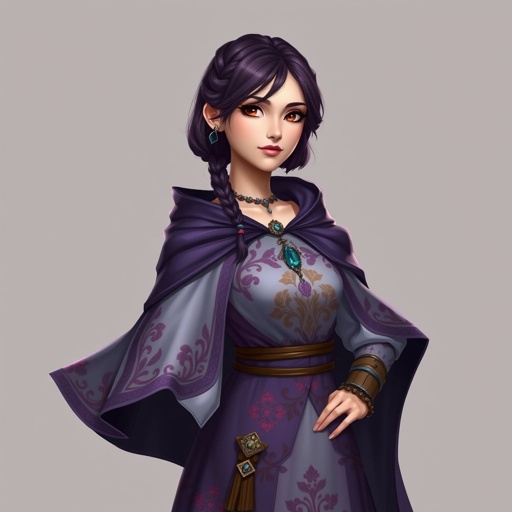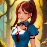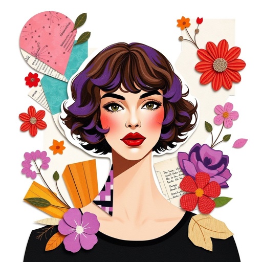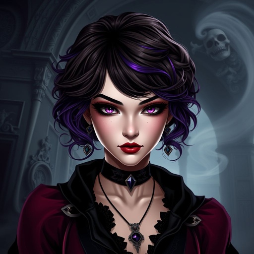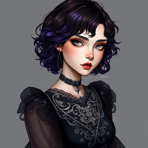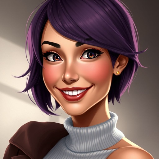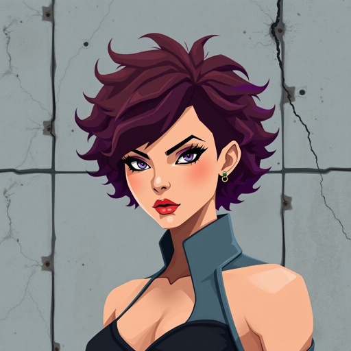 woman with short purple brown hair and big chest