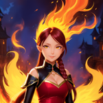 a woman in a red dress standing in front of a fire
