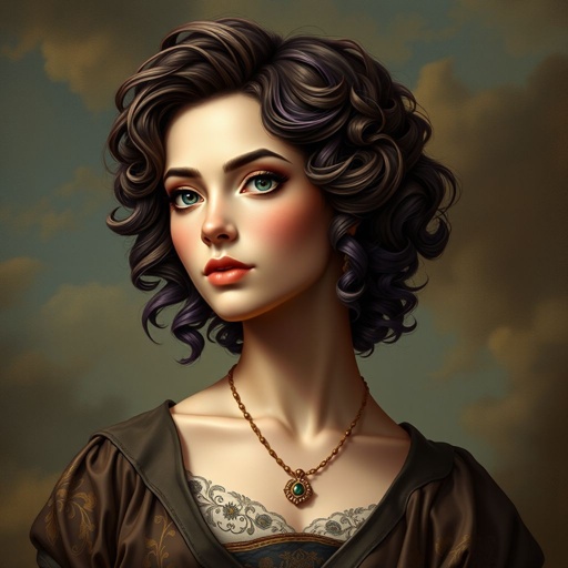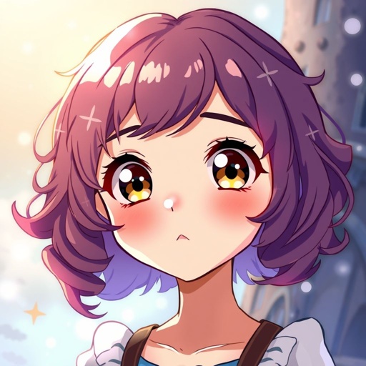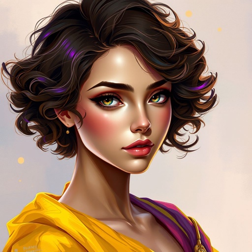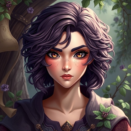 A girl with short purple brown curly hair and brown eyes with big breaths