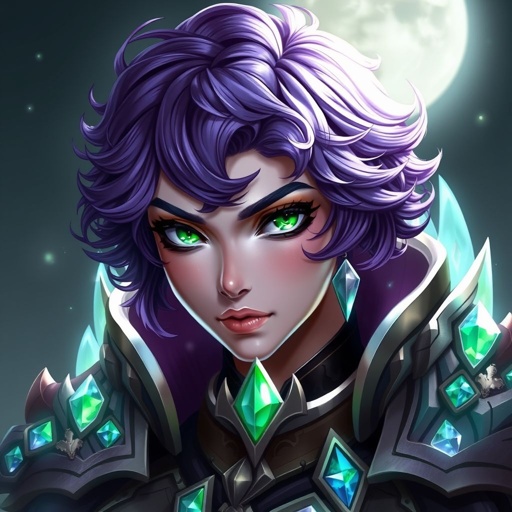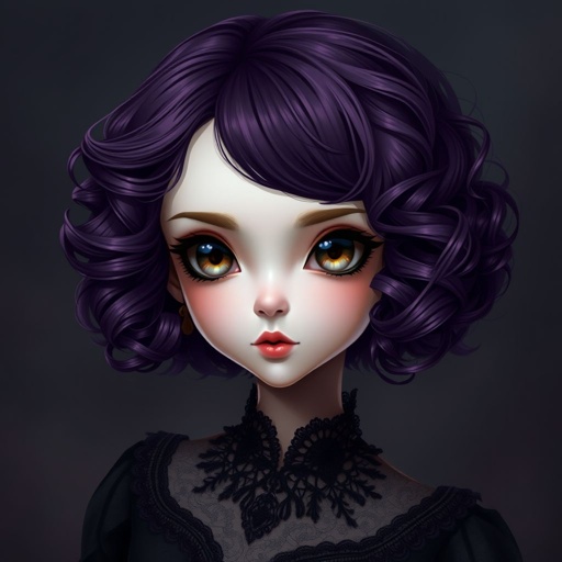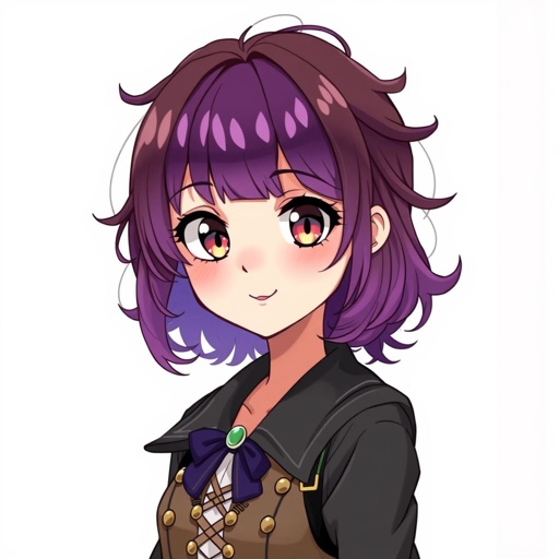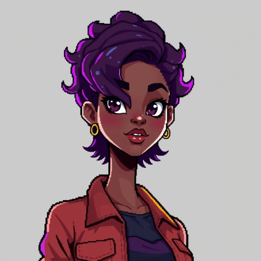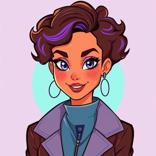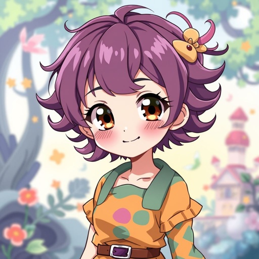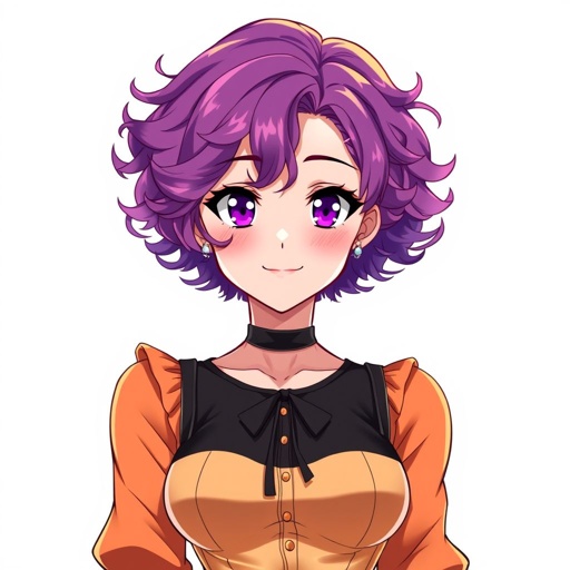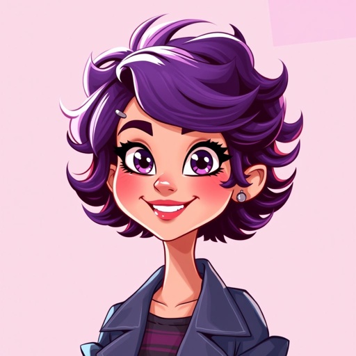 A girl with short purple curly hair