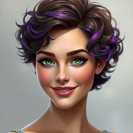 A woman with breast and short brown purple hair