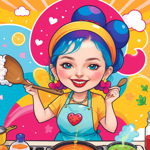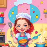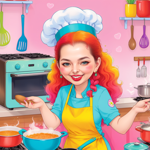 a cartoon girl cooking in a kitchen