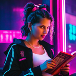 a woman reading a book in a dark room