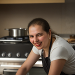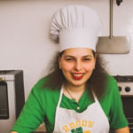 a woman wearing a chef's hat and apron in a kitchen