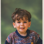 a young boy in a green shirt is standing in front of a forest
