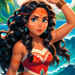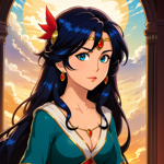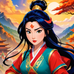 a woman with long black hair wearing a blue and red outfit