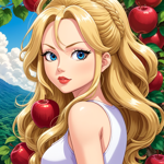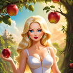 a beautiful blond haired woman standing in front of an apple tree