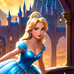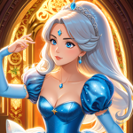 a snow princess with blue eyes standing in front of a castle