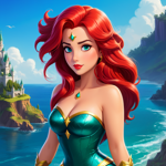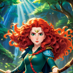 a girl with red hair and blue eyes standing in front of a forest