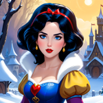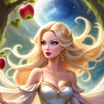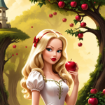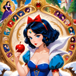 a snow princess holding an apple in front of a mirror