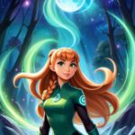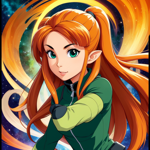 a girl with long red hair standing in front of a space background