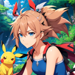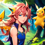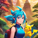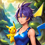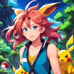 a girl with pink hair and blue eyes holding a pokemon pikachu