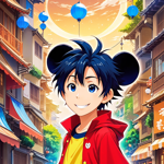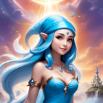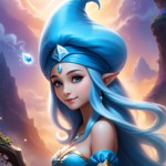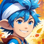 a cartoon character with blue hair and a white hat