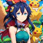 a girl with long hair and blue eyes holding a pikachu