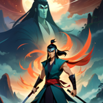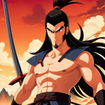 a man with long black hair holding a sword