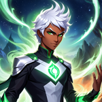 a man with white hair and green eyes standing in front of a mountain