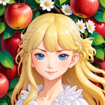a girl with long blonde hair and blue eyes standing in front of an apple tree